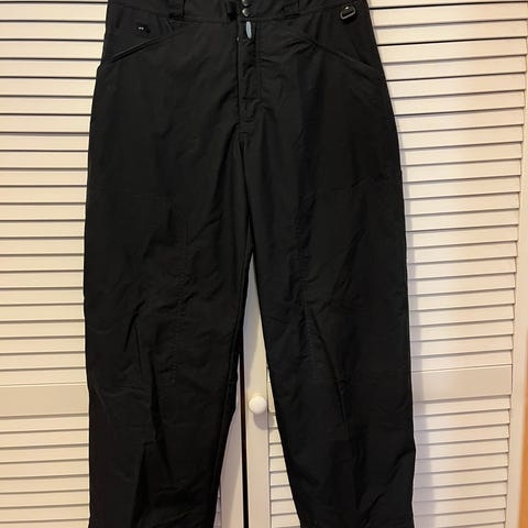 Koko on medium ja kunto aivan hyvä (näitä on käytetty ja tarkasti katsottuna se näkyy kankaassa ”haituvana”). Oikean reiden vetoketjutaskun vetskari on korjattu siististi. Lumilukot on, mutta kuminauha ei ole enää aivan tikissä, mutta pysyvät paikallaan nauhakoukkujen ansiosta.