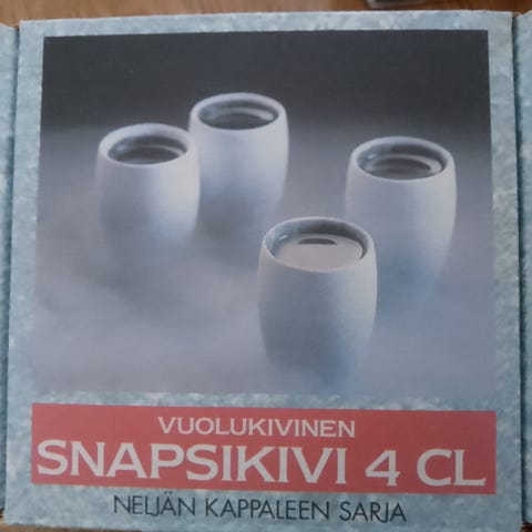 Snapsilasi vuolukivi, voi pakastaa. Näitä ei ole käytetty. 4 kpl 15€ yhteensä