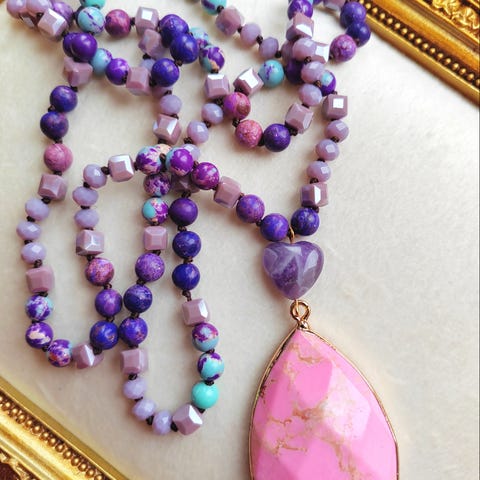 Pitkä nauha aidoista violetti-turkooseista jaspis-kivihelmistä sekä viistehiotuista lasihelmistä.