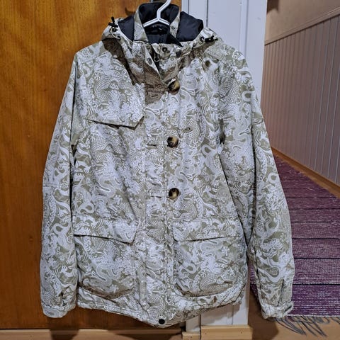 Takki on hyvässä kunnossa, ei huomautettavaa. Suljetaan vetoketjulla ja neppareilla. Taskut.
