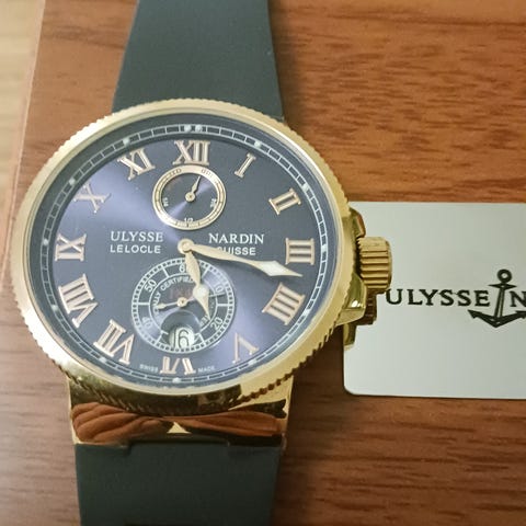 Nätti valkotauluinen roomallaisilla kirjaimilla varustettu mustarannekkeinen Ulysse Nardin Marin Chronometer. Ei alkuperäisiä papereita.