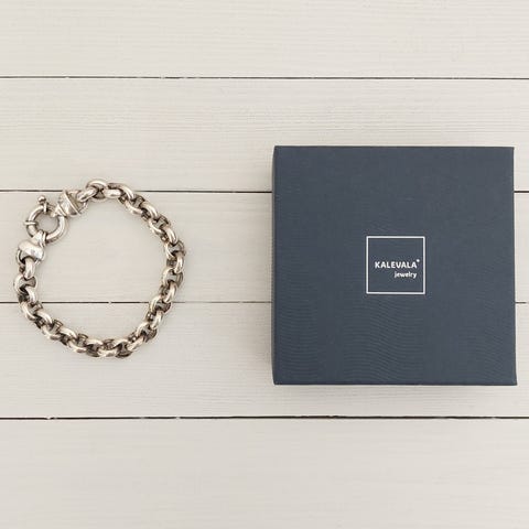 Yksinkertaisuudessaan ajaton hopeinen papuketjurannekoru, leveys 9,5 mm. Lenkit ovat onttoja. Jousirengaslukon leveys 15 mm. Pituus 19,5 cm.