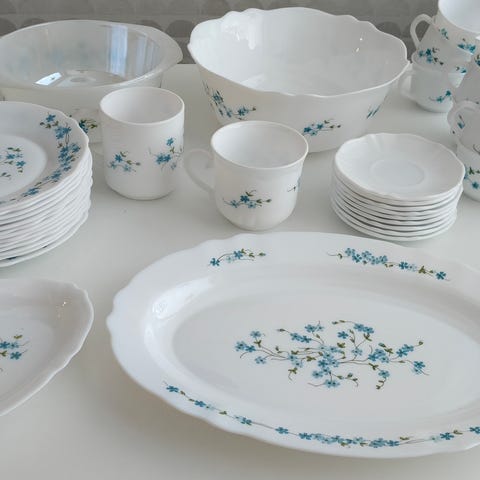 Uudenveroiset Arcopal Veronica kahvikupit 1970- luvun puolivälistä 12 kpl sekä kuppeja, että lautasia.
