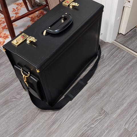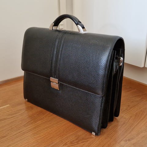 Musta nahkasalkku, jossa irroitettava ja säädettävä olkahihna. Hyvä salkku läppärille ym. työpapereille kuljetettavaksi. Päämitat kuvissa, mutta sisäsyvyys 28 cm ja leveys 7 cm. Tämä salkku ei ole lukittava (tosin niillä salkkulukoilla ei taida olla mitään käyttöä muutenkaan).
