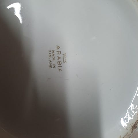 Aune Laukkasen Arabialle suunnittelema keittokulho n 2,5 l. Kulho on siisti lukuunottamatta sekä kannen että kulhon reunan pieniä riskuja sekä liimattua kannen nuppia.