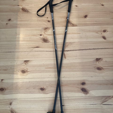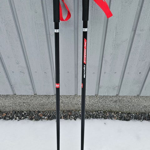 Yhdellä lapsella käytössä olleet Tecnopro -merkkiset sauvat. Nimikoitu, mutta nimi pyyhitty pois.