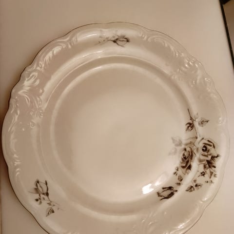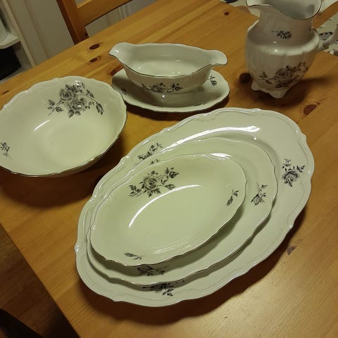 Hieno juhla astiasto. 6kpl matala lautanen, yhdessä pieni kolhu. 5kpl syvä lautanen yhdessä pieni kolhu. Maito kannu, kastike kulho ja kolme tarjoilu astiaa.