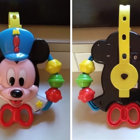Hyväkuntoiset muoviset vauvan lelut. Kuutiossa vaihtuu Mikin ja Minnin kuvat pyörittämällä ja samalla helisee. Luurissa voi pyörittää numeroita ja Mikin silmät liikkuu. Autoilija-Mikki ei helise, toimii puruleluna. Kaikki vaativat pesua, jos käyttöön menevät.