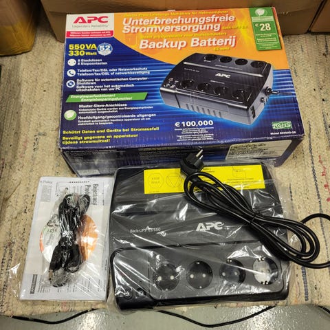 Hyvässä kunnossa oleva UPS sähkökatkoja ja jännitepiikkejä varten. Akku on vaihtokunnossa.