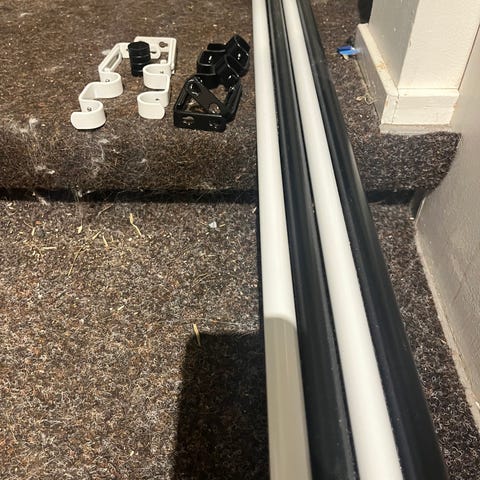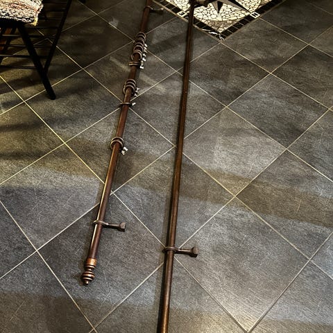 Erilaisia verhotankoja ja ripustustarvikkeita. Useimmat käytössä olleita.