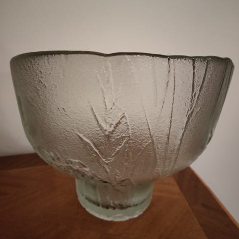 Myydään hyvässä kunnossa oleva Humppilan Lasin, Kaija Aarikan suunnittelema Heiniä kainalossa iso lasimalja.