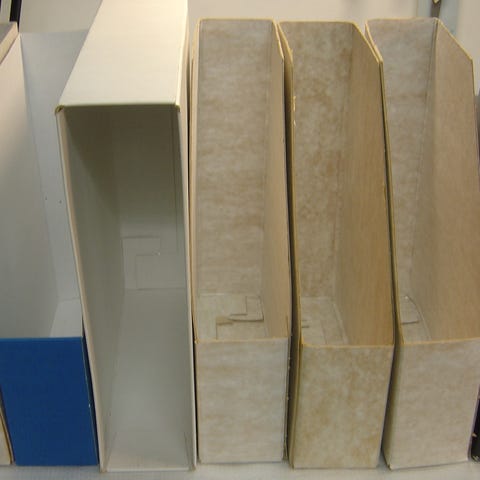 Kehys vaaleanharmaa, laatikot siniset. Laatikoissa otsakekilvet. Laatikosto on muovia.