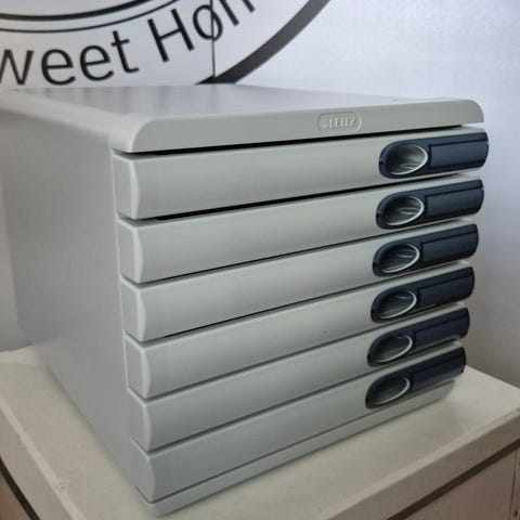 Ajattoman tyylikäs Leitz-työpöytälaatikosto. Kuhunkin laatikkoon voi sujauttaa asiakirjat helposti yläreunasta, laatikon korkeus noin 50 mm.