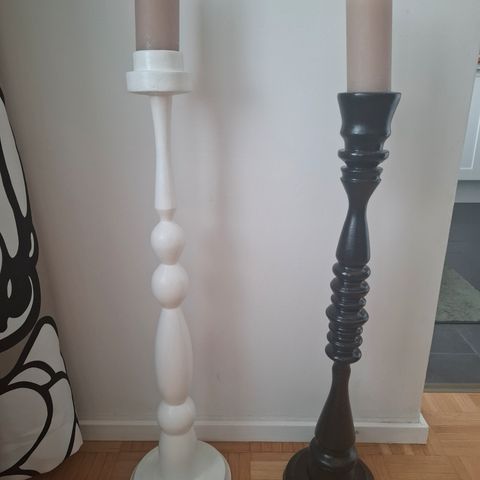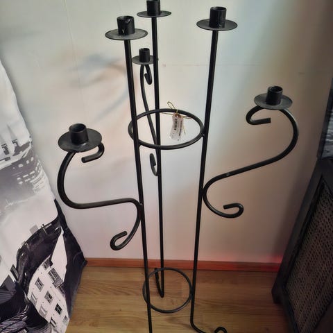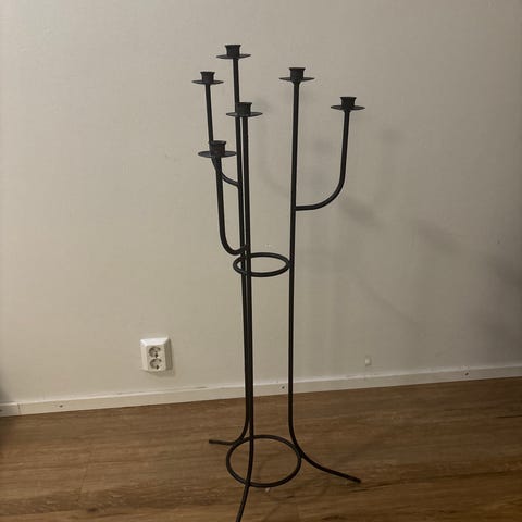 Musta korkea lattiakynttilänjalka (korkeus n. 112cm). Erittäin hyvässä kunnossa. Rungon saa kierritettyä kahteen osaan, niin helpompi kuljettaa. Nouto Hki Puistola