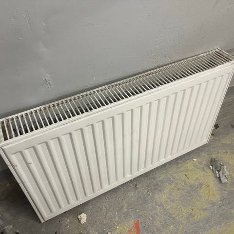 Vesikiertoinen lämmityspatteri ja kiinniikkeet.
