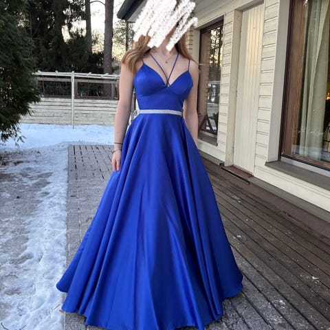 Kaunis hyvässä kunnossa oleva tummansininen vanhojentanssimekko. Ostettu Zazabellasta. Mekkoa käytetty pari kertaa. Mekon kokolapun mukaan kokoa 34/xs, mutta mielestäni vastaa paremmin kokoa 36/s. Olen 163cm ja tanssin pienillä koroilla. Vannehameen saa mukaan.