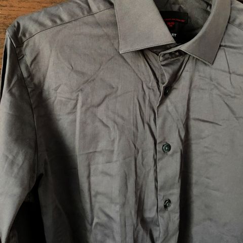 Sini ruudullinen helppohoitoinen kauluspaita. Nyt toki ryppyinen. Muuten hyväkuntoinen, mutta pesulappu kulunut. Varanappi tallella.