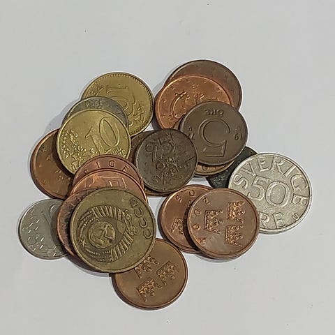Myynnissä eestiläisiä kolikoita rahakehyksissä.