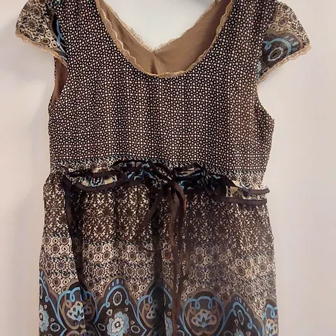 Indiska pehmeä glittertunika, viskoosia, väri mustanruskea & kultaista metallilankaa. Kokolappu kertoo M, mutta mielestäni tämä olisi liian tiukka M-kokoiselle. Sopii hyvin XS/S/34/36 -kokoistlle. Kai-kai 43cm, pituus 98cm. Pienet halkiot sivuissa. Pienet taskut edessä. Nouto tai toridiili pakettiin mahtuisi muutakin. Ks. ilmoitukseni.