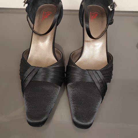 Kaksi kertaa käytössä olleet korkokengät. Satiinia, jossa strassikiviä. Muutama kivi irronnut, muttei haittaa kokonaisuutta. Korko n. 8 cm. Sisältä nahkaa.
