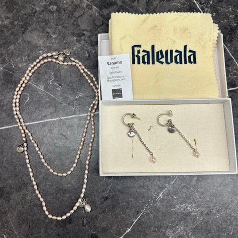 Myydään Kalevala Vanamo korvakorut ja sormus. Helmi vaaleanpunainen.