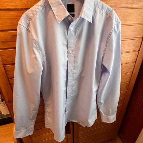 Vähän käytetty miesten kauluspaita, jossa on pieniä vaaleita kuvioita tummansinisellä pohjalla. Paita on 60% puuvillaa ja 40% polyesteriä.