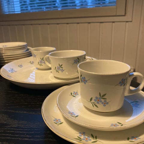 Harvinainen lastenastiasto. En ole pystynyt tunnistamaan astiastoa tarkemmin. Sisältää kaksi lautasta ja mukin. Mukissa on koira (hau hau), syvässä lautasessa kissa (kissi mirri) ja isossa lautasessa kana ja kananpoika (tipu tipu).