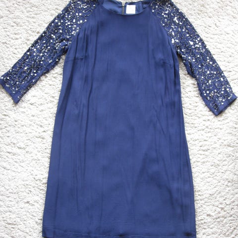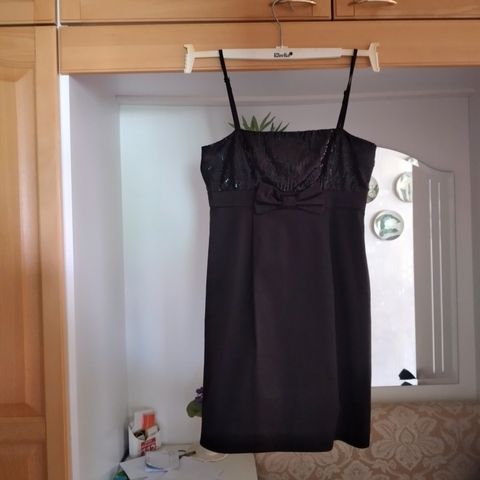 Uusi, käyttämätön juhlamekko Elinette, ostettu maahantuojan myynnistä, siksi ei materiaalilappua eikä kokolappua. Mekossa on päällekkäin kaksi mekkoa, joista alimmainen mekko pidempi. Kainalo-kainalo 47 cm, pituus 97 cm , arvelisin kooksi 38. Päälimekko ohutta kangasta, joka koristeltu paljetein.