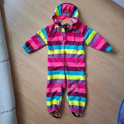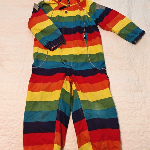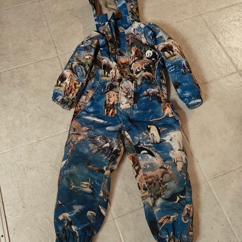 Molo välikausihaalari koko 98. Pieniä kulumisen jälkiä on mm. takapuolessa ja polvissa, sekä polvessa noin 0,5cm reikä mistä kuva. Yleisilmeeltään vielä siisti ja laadukas puku.