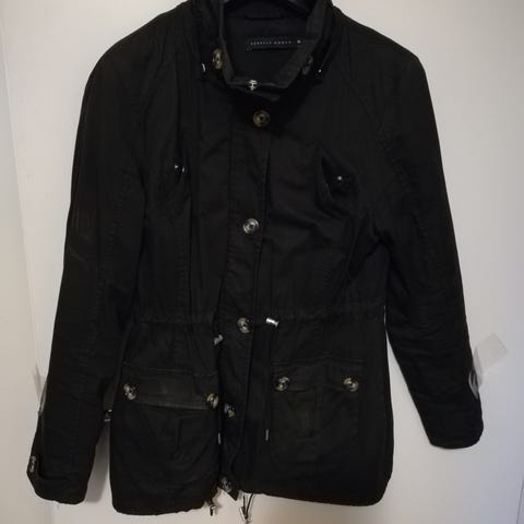 Kuvan siisti musta takki kevääseen ja syksyyn. Napit edessä sekä vyö. Hihan suissa rypytys.
