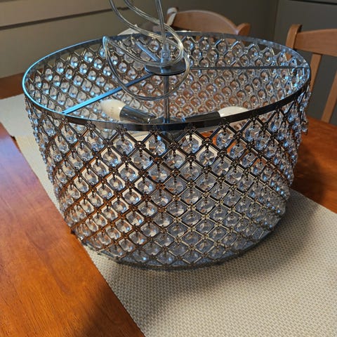 Kristallivalaisin pituus 150 cm, korkeus 30 cm. 12 polttimoa. Kaksi kannatin vaijeria , tällä hetkellä mitta 67 cm, säädettävissä. Keskellä töpselipistoke. Paino n.6 kg. Kare desing . Nouto savonlinna. Hinta 50e.