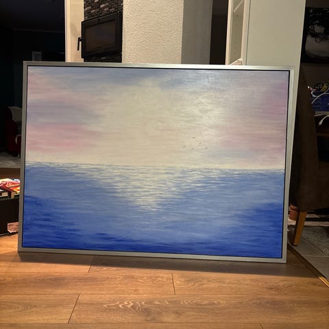 Näyttävä, suurehko taulu. Mitat: korkeus 148 cm, leveys 72 cm. Uutta vastaava. Hinta 28,00 euroa maksetaan käteisellä noudettaessa.