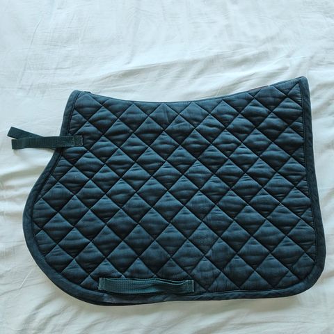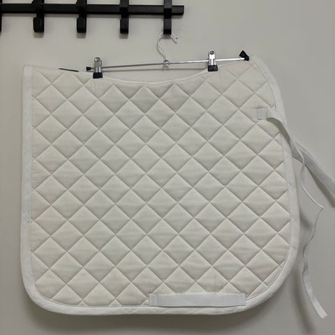 Eskadron valkoinen koulusatulahuopa, hieman mustaa värjäymää satulan kohdalla