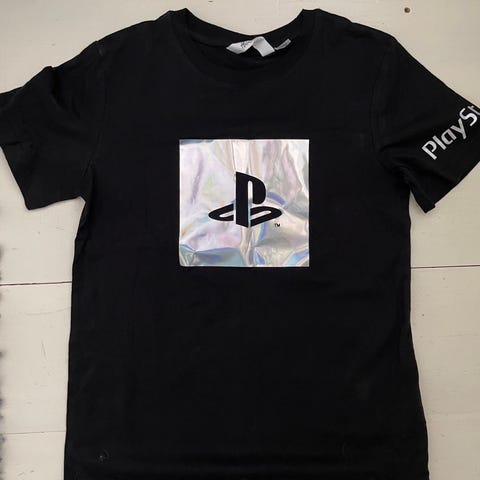 Käytetty musta T-paita H&M PlayStation koko 158/164. Rinnassa iso PS -logo ja vasemmassa hihassa teksti PlayStation .