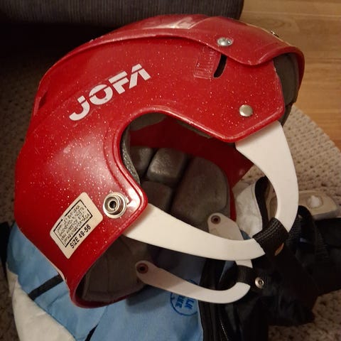 - Pienten lasten (n. 6-8 vuotiaiden) punainen Jofa-luistelukypärä, joka on ostettu käytettynä mutta on vielä suht siisti (leukahihnassa näkyy käytön jälkiä). Hinta 4e.
