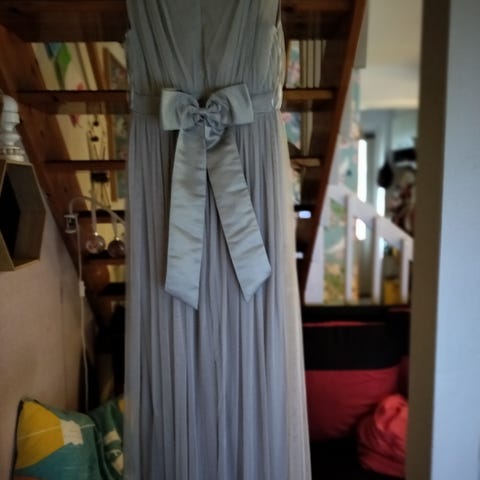 Kaunis pitkä Helminharmaa juhlamekko kokoa 36-38.