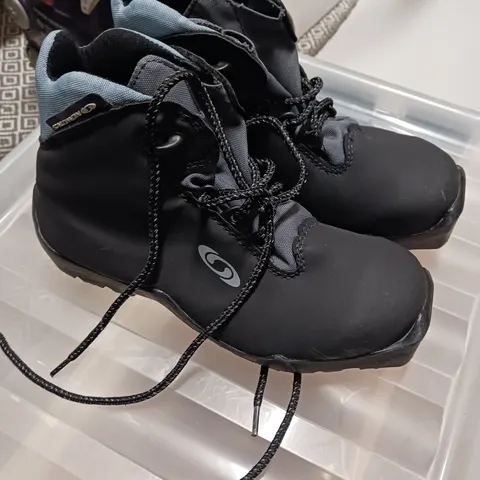 Sini-musta sävyiset Salomon SNS monot ovat kokoa 34 (pohjallisen on pituus 21,5 cm) ja ne on ostettu lapselle käytettyinä mutta ovat vielä suht siistit.