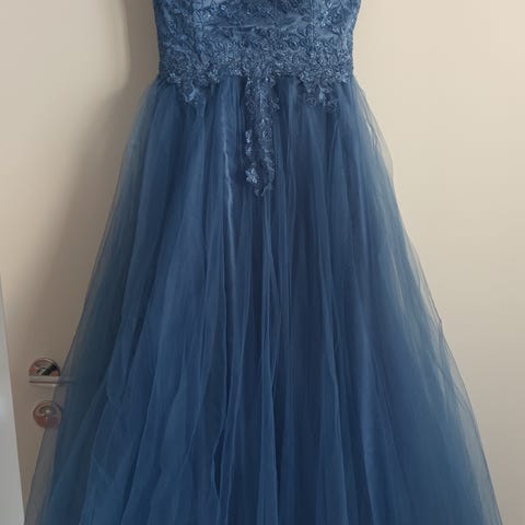 Tyttäreni juhlapäiväänsä aikanaan hankkima, juhlapäivänsä varovaisen käytön jälkeen siististi pukupussissa varastoituna ollut upea, kaunis ja naisellinen vanhojentanssimekko. Asu on S/XS-kokoinen, ja asun käyttäjä oli juhlien aikaan 162cm. Valmistaja/merkki: Juhlapuku Bella. Asun kunto erinomainen (ainakaan kangasvaurioita siinä ei ole eikä ulkopuolelle näkyviä tahroja, vaikka juhlapäivän jälkeen asua ei olekaan pesty).