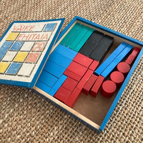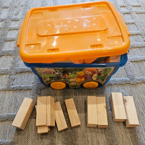 Palikkalaatikko, jossa runsaasti erilaisia palikoita vaikkapa talon rakentamiseen. Nouto Amurista.