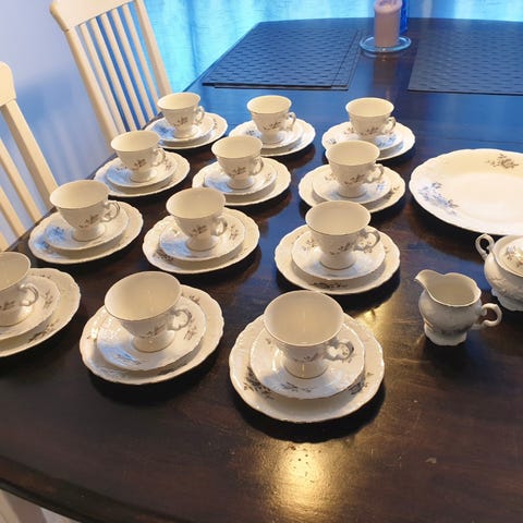 Kaunis, kukkakuvioinen kahviastiasto. Astiastoon kuuluu 6 kahvikuppia, 6 asettia ja 6 pullalautasta. Tarjoilulautanen ( halkaisija 24 cm), kannellinen sokerikko ja kermakko.