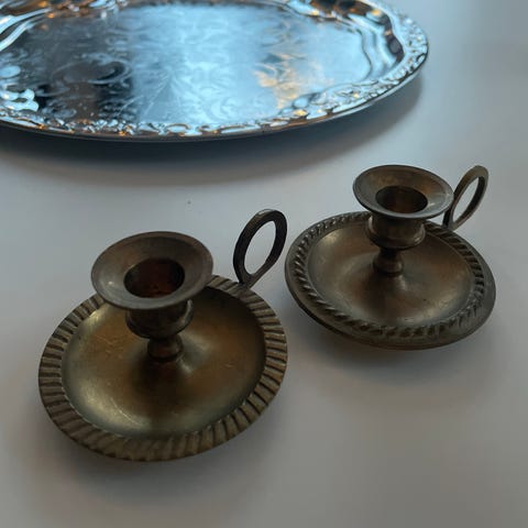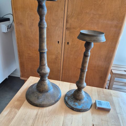 Antiikkiliikkestä hankitut vanhat oululaisen Helanderin pajan valmistamat messinkiset kynttilänjalat. Korkeus 13 cm 2 kpl ja 15 cm 1 kpl. Paino 180-200 g/kpl. Iän mukaista ajanpatinaa. Hinta 50 € kpl.