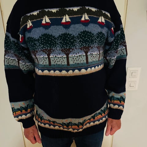 Vaimo teki mulle villapaidan mutta siitä tuli minulle liian iso (XL). Lanka 100 % norjalaista villaa, Hillesvåg Pelsullgarn Blåne. Väri konjakki.