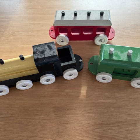 Juho Jussilan iso puujuna vaunuineen , ovet aukeaa,katto aukeaa. Kivat leikit vielä edessä tällä junavanhuksella. Renkaista maali hilseillyt, muuten kelpo peli , tuttu ihana klassikko jota valmistettu lasten iloksi jo vuodesta 1946 . Vankkatekoinen perinteinen höyryjuna, Koostuu veturista, matkustajavaunusta ja tavaravaunusta. Kokonaispituus 97 cm. Uustuotannossa hinta ollut 159e, enää ei saatavissa.