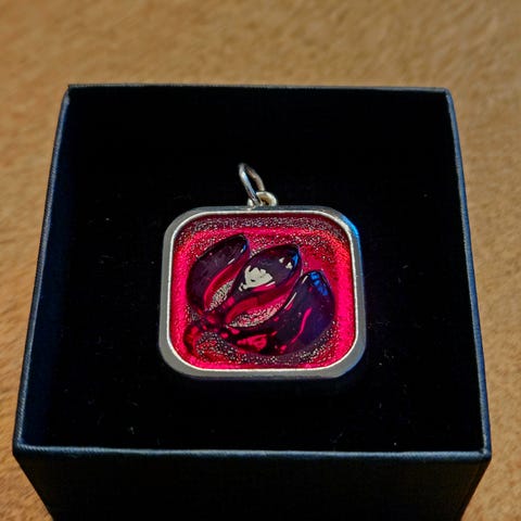 Hoffmannin kertomukset -riipus, (ei ketjua eikä pantaa). Kirsti Doukasin suunnittelemaa oopperasarjaa. Hopeaa, kivi persikanvärinen.