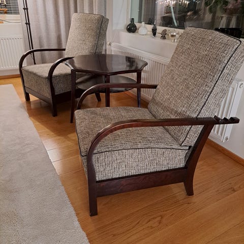 2kpl 60luvun nojatuolit,puunojat ja jalat.Korkealla selkänojalla,tukeva istua