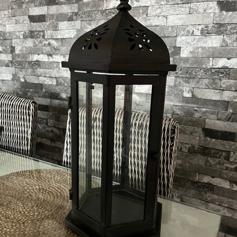 Metallinen valkoinen lyhty. Lasikupu ehjä. Puinen pohja. Koko 17x17, kork. 35cm.