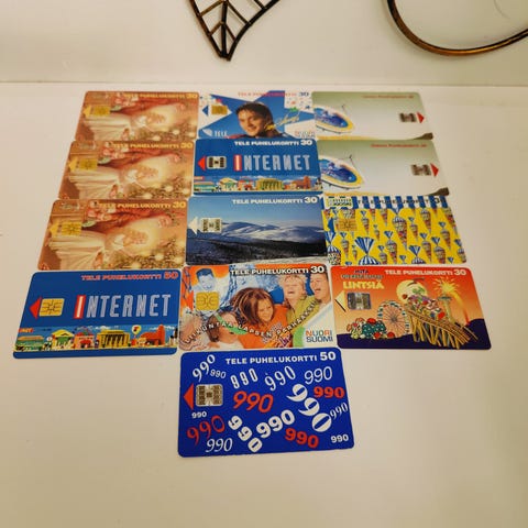 Myydään kuvan mukaisia puhelukortteja 12 kpl, käytetty. 3kpl Sonera ja 9kpl Tele kortteja.