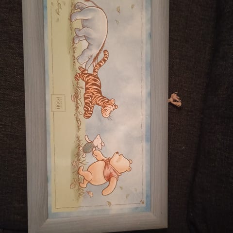 Nalle Puh taulu. Tässä jo elämisen jälkiä mm. mustia jälkiä yläreunassa. Pituus 56cm, leveys 30cm)