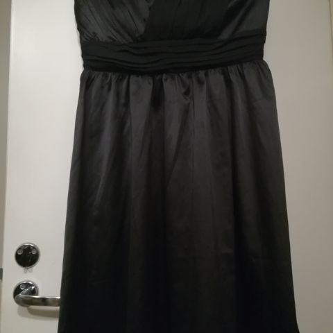 Kerran käytetty pitkä juhlamekko. Musta/harmaa. Irrotettavat olkaimet. Kaksin kertainen helma. Koko 14 luultavasti suomi koko 40.