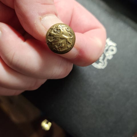 Pellosta löydetty vanha nappi, teksti: GEORGE IV STANDARD, alueella sijainnut vanha pappila aikoinaan. Harvinainen löytö.
